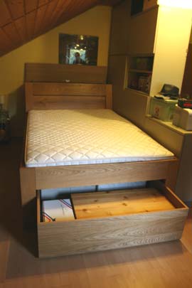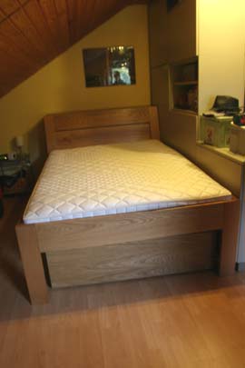 Eiche Massiv-Bett mit rollbarem Bettkasten
